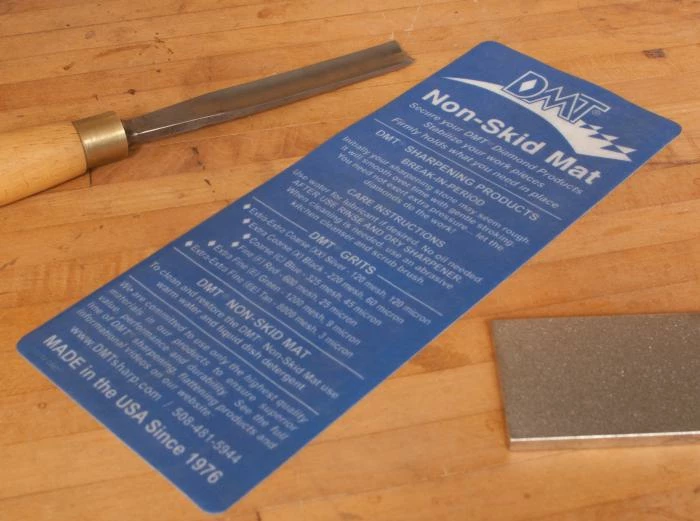 DMT Non-Skid mat is the answer to our non-skid prayers. We use them under sharpening stones and workpieces to keep slippery from sliding.