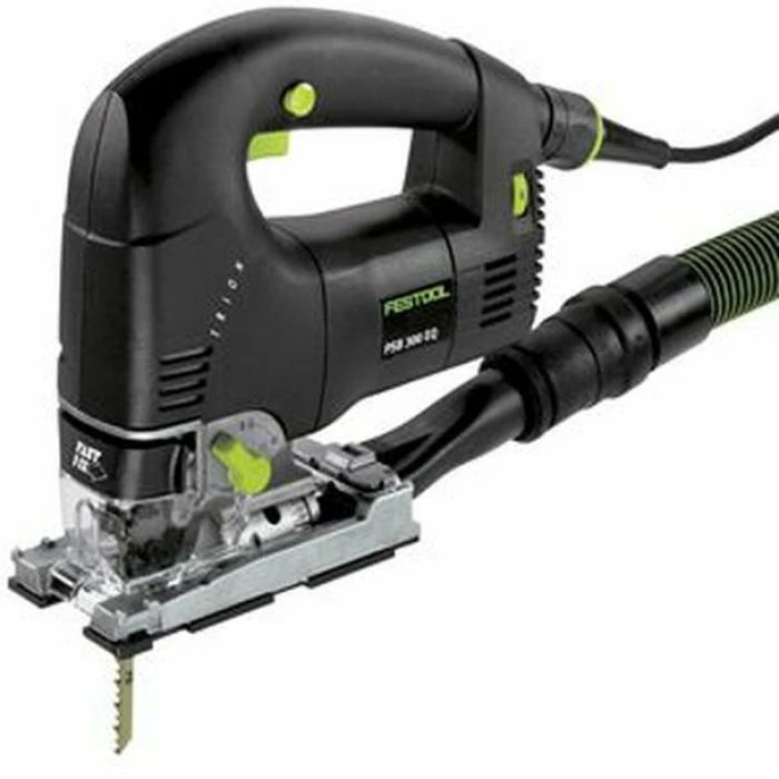 out Festool so while he called the guy waiting for the elevator to inform him of such news and to browse around while waiting. He poked around the display, picked up a jigsaw, thought it seemed to be built right and then asked the price. We revived him and then he wanted to know why it was so expensive. The best way to sell Festool is to put it into a customers hands so we set up the saw. To insert a blade you open a latch and drop in a blade, no tools or fuss required. The vacuum attachment is standard and just clips on the