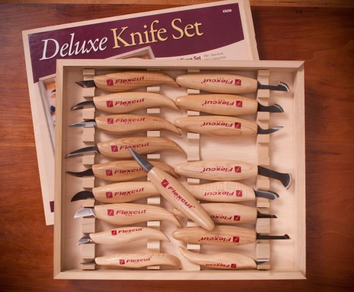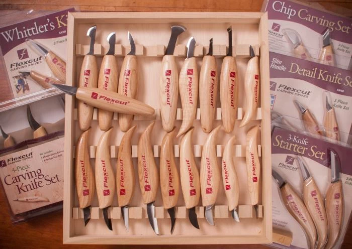 Three and four piece knife sets are a good way to get into knife carving, and both the 4 piece Carving Knife Set or the Starter Set have a range of blades novices will find useful well beyond their first project. The Chip Carving, Detail, Whittler’s sets are more purpose specific, and make good additions to an existing tool kit, or when tackling a specific project. If you want it all, the 18 Knife Deluxe set is where it’s at, and for the serious knife carver, there’s not a better value.