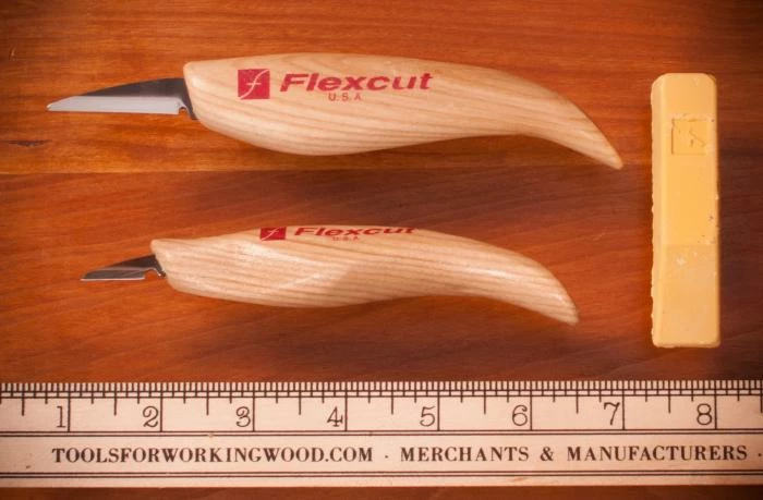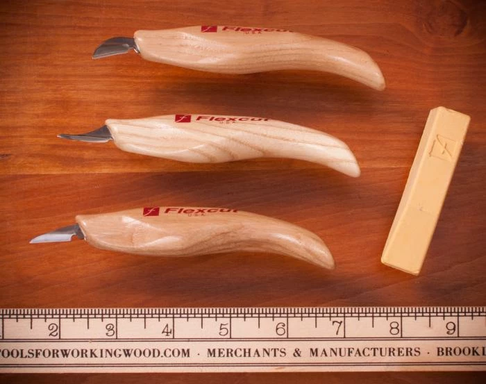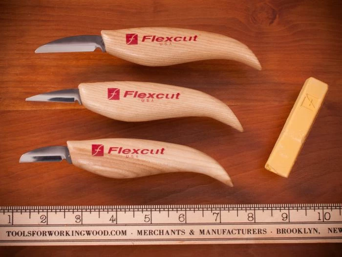 Two sizes of chip carving knife, as well as a skew for making stab cuts. Includes a small block of Flexcut Gold honing compound.