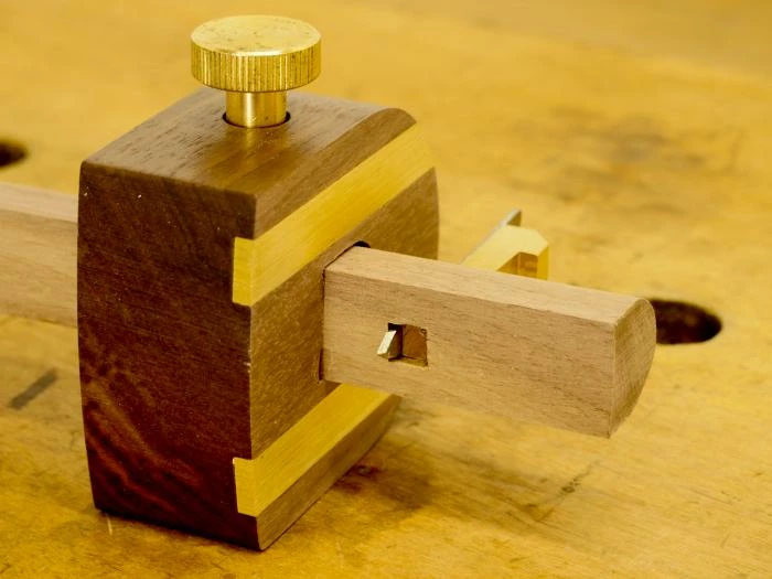 Cutting Gauges are like marking gauges, except they use a knife instead of a pin. They’re used for scoring across the grain and can also be used for cutting strips of wood veneer and small rebates. The cutter is secured in place with a brass wedge, which also enables removal for sharpening the cutter. The Marples cutting gauge features a half-round head (easier to hold) with inset brass wear plates, and locks with a thumbscrew. We offer the Marples cutting gauge in either American black walnut or beech (rosewood is no longer available). 9 1/2″ long stem. Made in Sheffield, England by Joseph Marples.