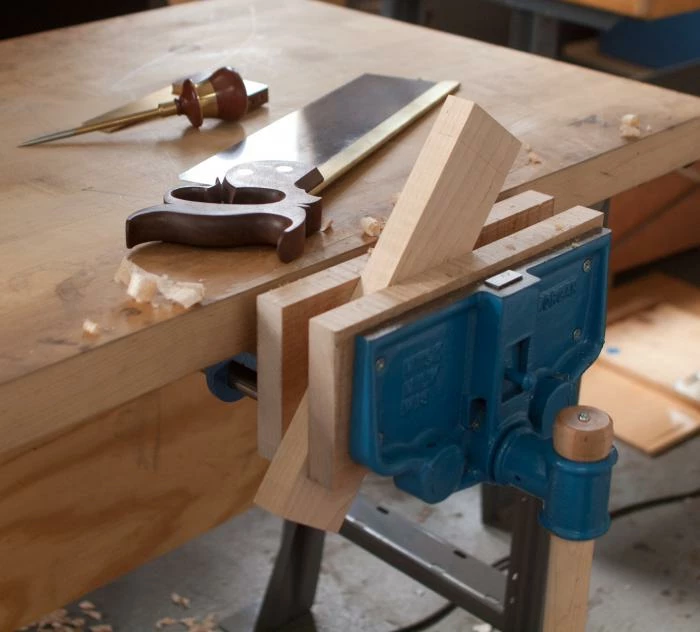 We supply the vise with all the hardware needed to install the vise in a typical configuration, attach a riser block if your bench top is less than 2 1/4″ thick, and affix a pair of jaw liners. The vise is attached to the bench using a couple of lag bolts from underneath and a few wood screws from the rear jaw into the bench. Oh, and we also include an extra couple cotter pins so you don’t have to save the bent one you pull out to install the vise.