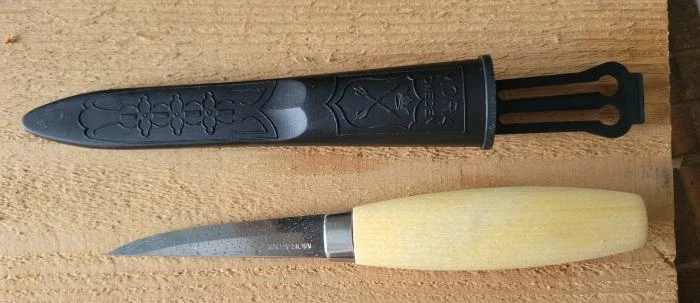 The oiled birch wood handle is designed for comfort and quality of grip. The knife comes with a plastic sheath to protect the razor sharp edge from damage and to protect delicate fingers from the razor sharp edge.
