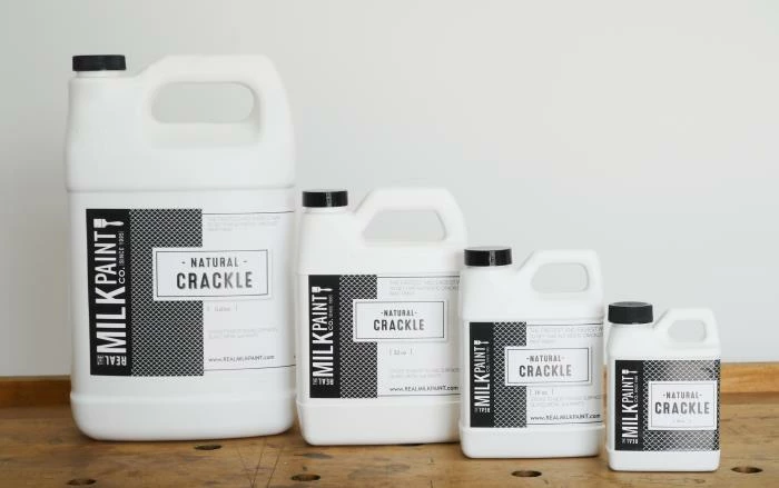 For thin cracks, use one coat of Natural Crackle over the milk paint. (Thinning Natural Crackle will result in even smaller cracks.) For larger cracks, apply two coats of Natural Crackle over the milk paint, allowing each coat to dry, then apply two coats of milk paint over the Natural Crackle. (The first coat of milk paint will still be wet but dry enough to accept a second coat.) Apply with either a brush or a roller. Natural Crackle dries to a satin sheen. Drying time is fast – 30 minutes to 2 hours.