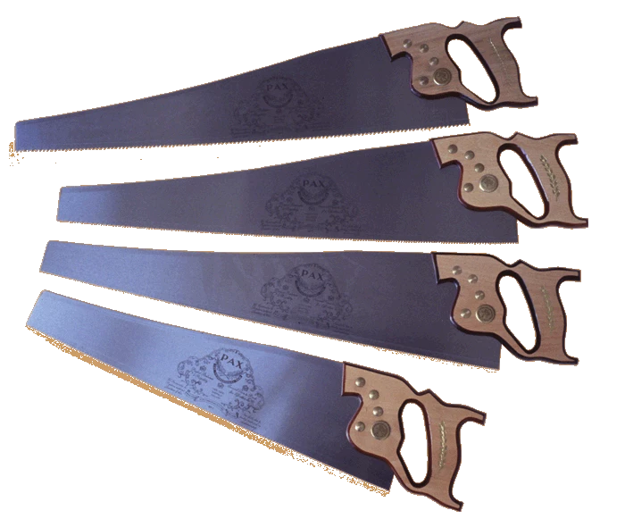 High quality saws by Pax have been made in Sheffield, England since 1776, right about the time that steel for making saws was first available in commercial quantities. In those days, craftsmen used handsaws ten hours a day, six days a week, so these tools had to be up to the challenge. As more and more people re-discover the efficiency and pleasure of using hand tools, handsaws are having a well-deserved comeback. The key, of course, is finding a well-crafted, hand-sharpened saw like those made by Pax. They are truly some of the finest handsaws available today, with features that make your work come out better. The blade of a Pax saw is taper-ground, which means that the back of the saw is ground slightly thinner than the cutting edge, so that the saw doesn’t bind in the cut. The saw is “breasted,” which means that the edge of the saw with the teeth is slightly convex. The curve counteracts the natural swing of hand sawing, putting more teeth in contact with the wood and cutting faster. These saws are hand sharpened by filing, a traditional method for top-of-the-line saws because it produces a better result than machine sharpening. The handles are of fine, two-tone, steamed beech with a durable hard gloss surface that will last a long time.